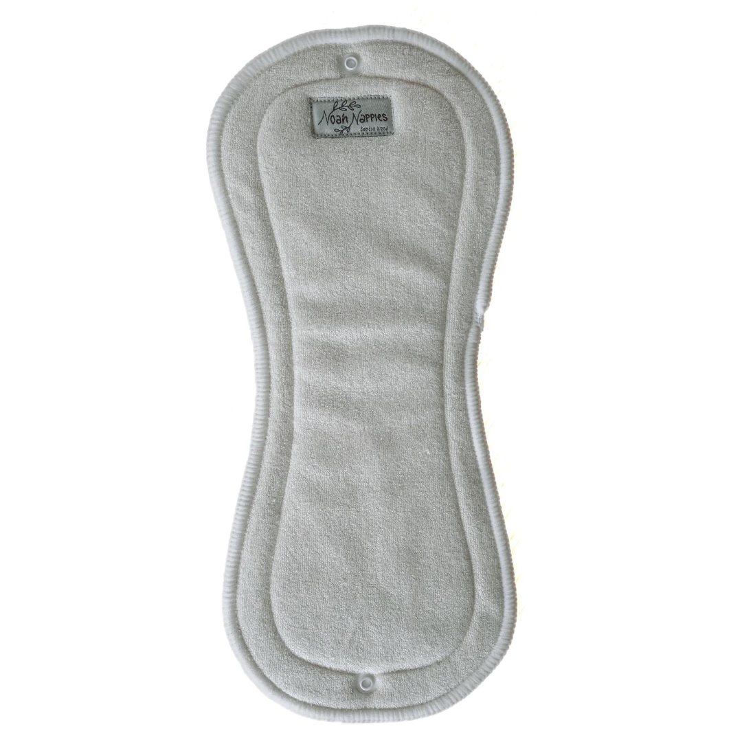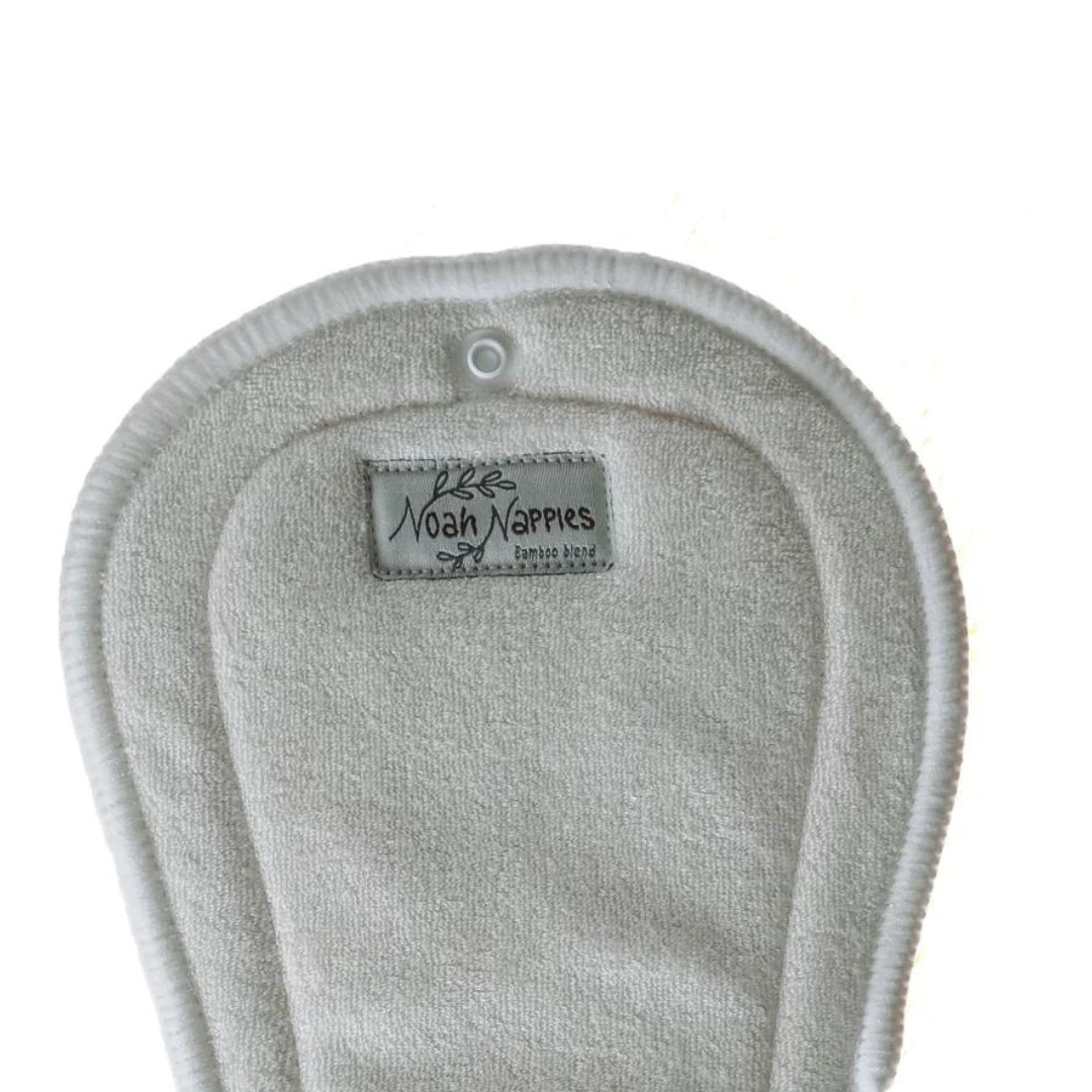 8 laga bambus innlegg frá Noah Nappies er gert úr 8 laga bambus terry blöndu sem gerir það virkilega mjúkt og sérlega rakadrægt. Innleggið má liggja uppvið húð barnsins, innleggið passar í flestar one size taubleyjur pg er fest með tveimur smellum.