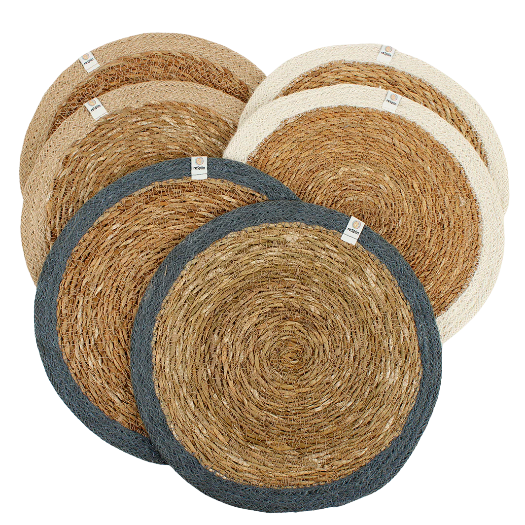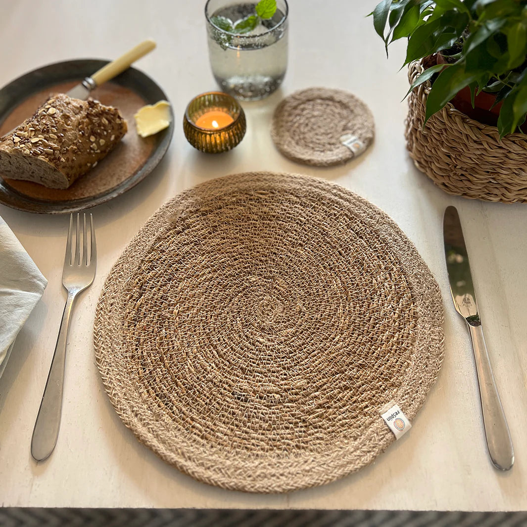 Skapaðu hlýlegt og náttúrulegt borðhald með þessari fallegu diskamottu úr vefnu sjávargrasi. Brúnin er gerð úr sterkum jútutrefjum sem gefa mottunni fallegan ramma og notalegt yfirbragð.