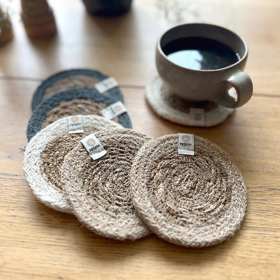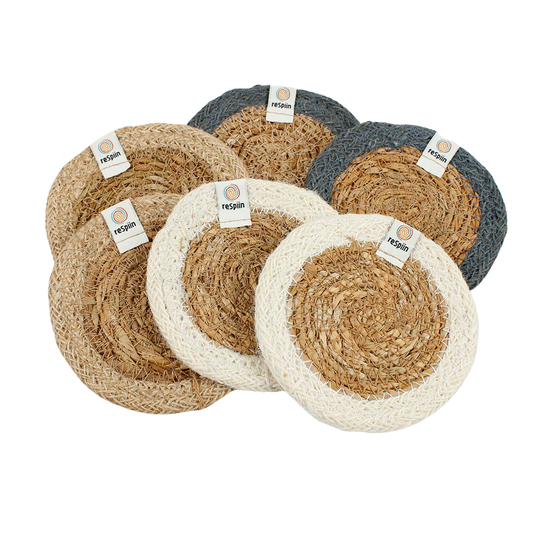 Úr sjálfbæru sjávargrasi og jútu. Lituð með eiturefnalausum litum og örugg til notkunar með mat. Hver motta ber lítið ReSpiin-merki saumað á brúnina.