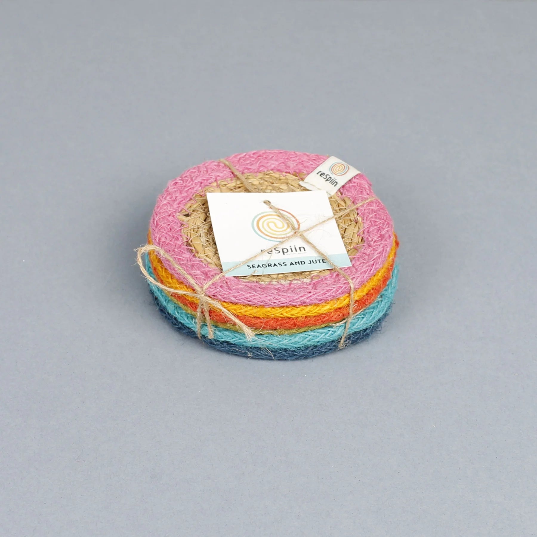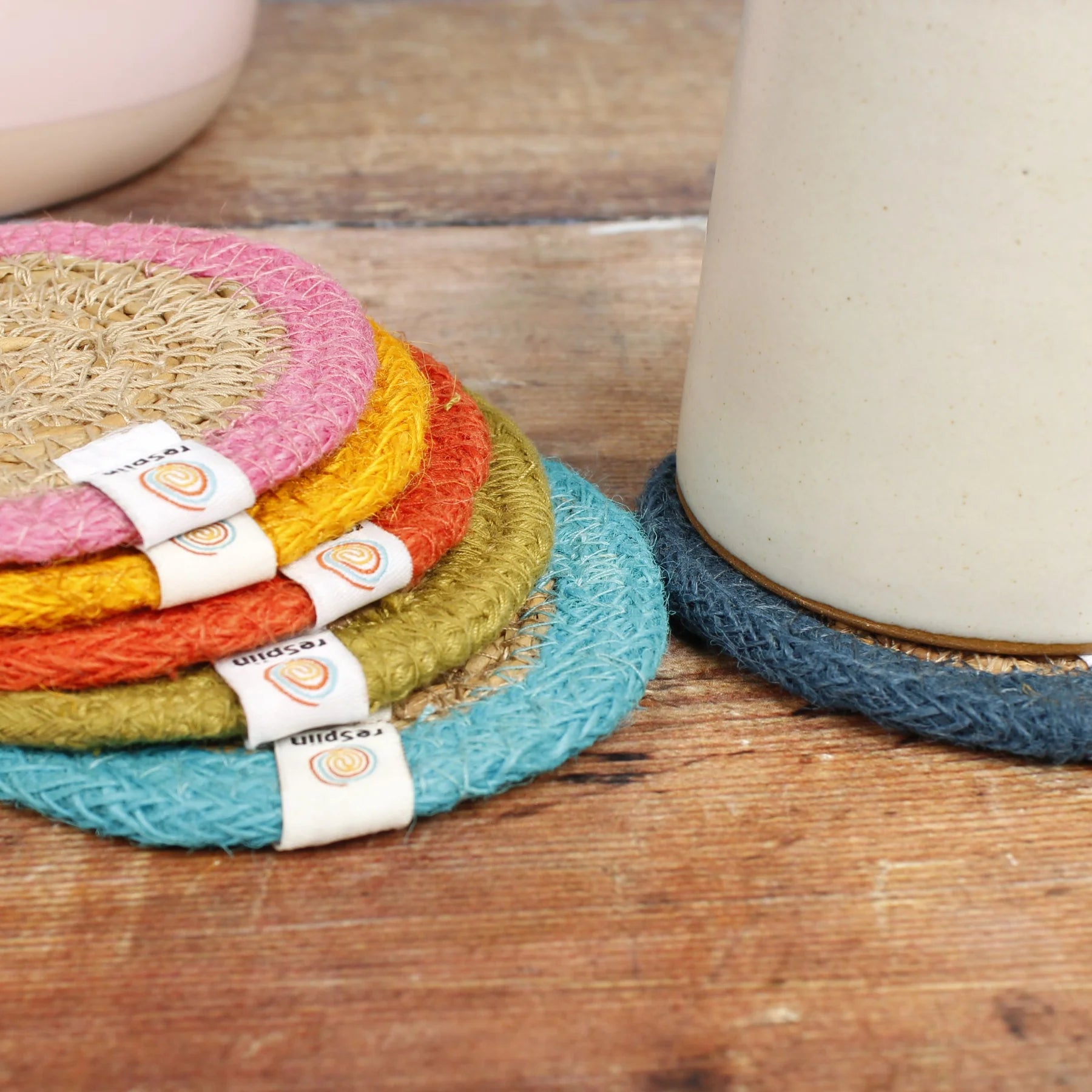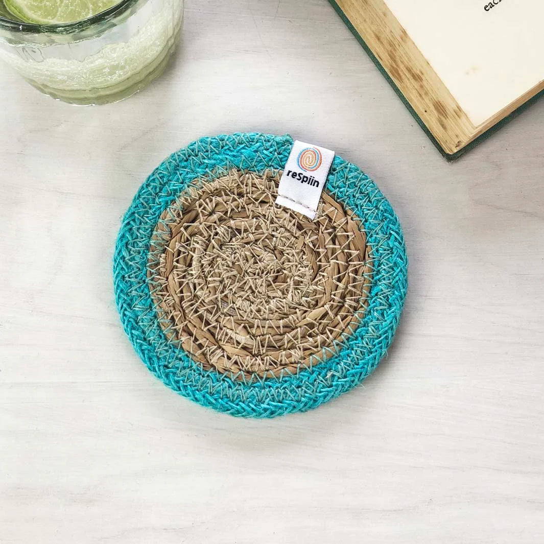 Úr sjálfbæru sjávargrasi og jútu. Lituð með eiturefnalausum litum og örugg til notkunar með mat. Hver motta ber lítið ReSpiin-merki saumað á brúnina.