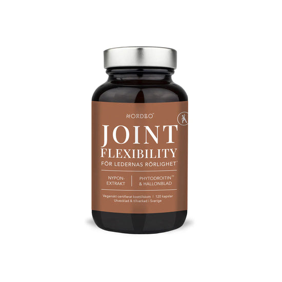 Joint Flexibility er þróað fyrir þá sem eru með stífa liði en einnig fyrir þá sem eru líkamlega virkir. Nordbo Joint Flexibility sameinar þrjú virk innihaldsefni úr plöntum: Rosehip, Phytodroitin™ og Hindberjalauf (Raspberry leaf). En þessar plöntur hafa bólgueyðandi virkni og geta dregið úr liðverkjum og stirðleika.