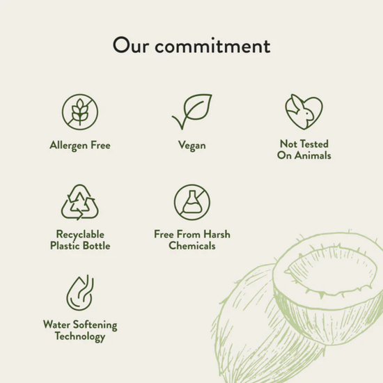 Powered by 12-13 naturally derived biodegradable ingredients: Pareth-7 (coconut), Sodium Olefin Sulfonate (coconut), Tri-Sodium Citrate (fruits, corn), Glycerol (soy bean, coconut), Potassium Cocoate (coconut), Sodium Alkyl Benzene Sulphonate, Sodium Cumene Sulphonate, Phenoxyethanol, Sodium Carboxymethyl Inulin (chickory root), Parfum (Baby Blossom Variant, Allergen-Free), Polyvinyl-Pyrrolidone and aqua.