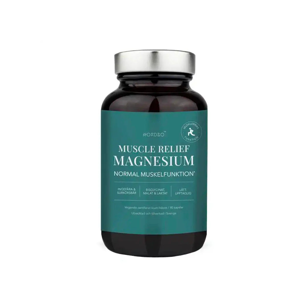 Muscle Relief Magnesium er fæðubótarefni sem er þróað fyrir þá sem stunda stífa líkamsþjálfun og íþróttir og verða fyrir vökvatapi. Einnig hefur Muscle Relief hjálpað þeim sem glíma við sinadrátt og fótaóeirð. Með þremur tegundum af hágæða magnesíum í bland við engifer og súr kirsuber stuðlar Muscle Relief Magnesium að minni þreytu, eðlilegri vöðvastarfsemi og endurheimt. 90 hylki. Daglegur skammtur 1-3 hylki.