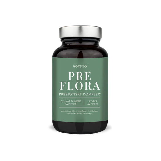 NORDBO PreFlora inniheldur fimm prebiotic trefjar sem talnar eru sjá um starfsemi magans og geta reynst sem fæða fyrir góðar bakteríur í þörmum. Prebiotic flóra er blanda af arabínógalaktantrefjum, inúlíni, frúktólógósykrum, ómeltanlegri sterkju og pektíni, sem öll eru talin geta stuðlað að jafnvægi í þörmum og hagstæðu umhverfi fyrir mjólkursýrubakteríur. Varan er fullkomin samhliða inntöku á LactiMood. Framleitt í Svíþjóð og vottað” I'm Vegan” af sænsku dýraverndunarsamtökunum.