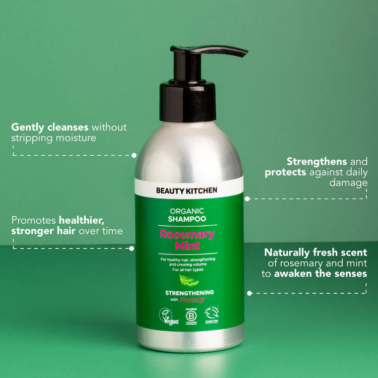 Sterkara og heilbrigðara hár byrjar við rótina! Rosemary Mint Strengthening Shampoo inniheldur virk efni sem hreinsa, næra og endurlífga hárið. Rósmarín og mynta örva hársvörðinn, stuðla að hárvexti og skilja hárið eftir ferskt, mjúkt og fullt af lífi.